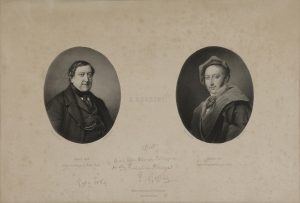 ─ DOUBLE PORTRAIT LITHOGRAPHIÉ par Auguste LEMOINE, en deux médaillons, l’un « d’après le peintre Viennois Mayer », Naples, 1820, l’autre d’après une photographie de Numa Blanc, Paris 1860. La gravure fut éditée par Heugel et Cie, au Ménestrel.