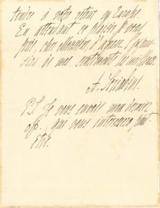 Il a reçu de Leipzig par M. Schaeffer « le programme de votre concert, ainsi que les critiques, que vous avez eu l’amabilité de me faire transmettre. Je vous remercie vivement de votre souvenir et je tiens à vous exprimer toute la satisfaction que j’éprouve à savoir quelques-unes de mes œuvres en de si bonnes mains. J’espère avoir l’occasion de vous entendre à votre retour en Europe. […]