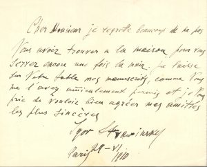 « Cher Monsieur je regrette beaucoup de ne pas vous avoir trouver à la maison pour vous serrer encore une fois la main. Je laisse sur votre table mes manuscrits, comme vous me l’avez amicalement permis »…