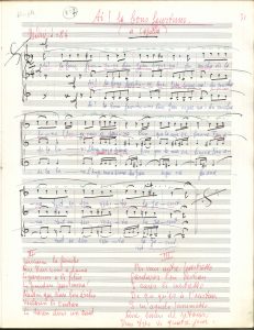 Le manuscrit est noté, sur un premier jet au crayon, à l’encre noire sur papier à 30 lignes ; les paroles sont notées au stylo bille bleu, avec les couplets au stylo rouge à la suite de certaines pièces.