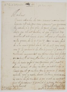 « J’avois attendu de vous scavoir arrivé au lieu ou vous estes, pour vous asseurer que personne du monde, n’a pris plus de part, que moi, aux chozes qui vous ont touché, et que ji ai esté tres sensible. A ceste heure je suis obligée a vous rendre mille graces, de la justice que vous m’avez faicte de n’en avoir point douté, et de ce que vous avez creu que le souvenir de Monseigneur le grand Cardinal [RICHELIEU] augmentoit ma peine dans ceste facheuse rencontre. Il est vrai, Monsieur, que cela m’estoit bien dur, de veoir souffrir une personne qu’il avoit si cherement aimée, et dans un lieu qui estoit a lui, si j’avois pu vous y rendre tous les services que j’aurois souhaitté, vous y eussiez donné l’ordre, mais au moins j’ai essaié de faire tout ce qui a esté en ma puissance »…