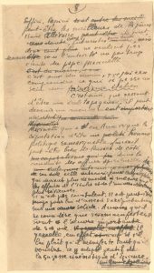 Le manuscrit, qui a servi pour l’impression, présente des ratures et corrections, et des variantes avec le texte définitif ; une page est écrite au dos d’une enveloppe adressée au « Sous-Lieutenant Guillaume Apollinaire » à l’Hôpital du Gouvernement italien, à Paris (3 août 1916).