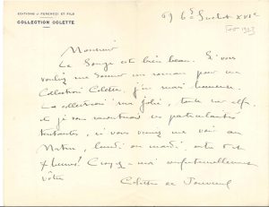 « Le Songe est bien beau. Si vous vouliez me donner un roman pour ma Collection Colette, j’en serais heureuse. La collection sera jolie, toute sur alfa, et je vous raconterais ses particularités tentantes, si vous veniez me voir au Matin, lundi ou mardi »…