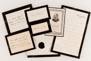 Goujon. Il est joint à cette lettre une carte de visite de la comtesse de Paris, une carte de visite du duc de Chartes, un mémento souvenir de la mort du comte de Paris et une carte portant l'inscription manuscrite : « Cadre trèfle à quatre feuilles. Souvenirs du comte de Paris, veuillez accuser réception à Madame la comtesse de Paris ». Texte en français. Dans cette lettre, le duc parle de la mort de son frère le comte de Paris.