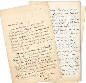 Il lui rappelle sa promesse de 500 ou 600 francs, et le prie de lui en envoyer le plus possible : « J’ai aujourd’hui même 300 F à payer, et je n’ai pas 50 F à la maison. Comme nous sommes en froid avec Dommange à cause de toutes ses bêtises je ne puis renvoyer à lui »…