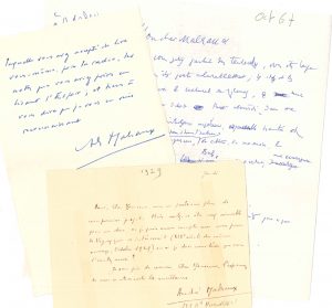 • 2 brouillons autographes de lettres de MONTHERLANT, l’un du 27 octobre 1959, défendant Tête d’Or, « une pièce étrange, puissante et qui mérite le respect » ; au sujet des Antimémoires : « vous jetez partout des tentacules, vous êtes large naturellement, comme vous êtes poète naturellement »…
