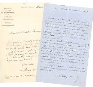 Henry MONNIER (1799-1877). 6 L.A.S., 1846-1875 et s.d. ; 6 pages et demie in-8, un en-tête Ministère de la Maison de l’Empereur et des Beaux-arts, 2 adresses.