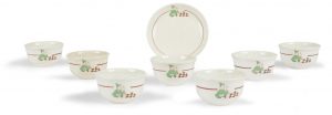 [Sacha GUITRY]. 7 tasses à chocolat et 1 soucoupe décorées, [vers 1911].