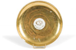 [Sacha GUITRY]. Soucoupe en porcelaine blanche et or à décor au centre du monogramme SG et la date 21 février 1936. Marquée au dos Delvaux / rue Royale / Paris.