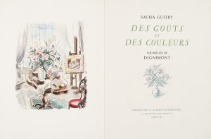Sacha GUITRY. Des goûts et des couleurs. Aquarelles de DIGNIMONT (Édition de la Galerie Charpentier, 1943). In-4, relié maroquin rouge avec insert de papier marbré sur les plats, couv. et dos conservés (F. Dupont).