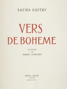 Sacha GUITRY. Vers de Bohème. Illustré par Émile COMPARD (Raoul Solar, 1947). In‑4, en feuilles, couv. impr., sous emboîtage d’éditeur.