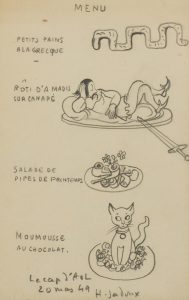 Henri JADOUX (1904-1999). MENU autographe signé avec DESSINS, « Le cap d’Ail » 20 mars 1949. Crayon noir, 17,5 x 11 cm.
