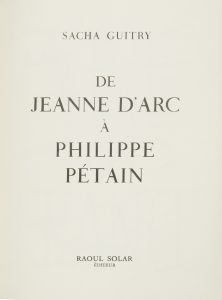 Sacha GUITRY. De MCDXXIX à MCMXLII, c’est-à-dire : De Jeanne d’Arc à Philippe Pétain, c’est-à-dire : 500 ans de l’histoire de la France, ouvrage conçu, composé et commenté par Sacha Guitry… (Raoul Solar, 1951). In‑fol., reliure...