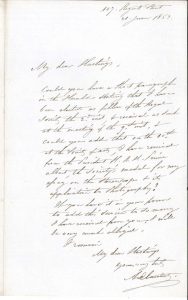 Il demande si Hastings ne pourrait obtenir un bref paragraphe dans le Herald pour annoncer son élection et sa réception comme membre de la Royal Society, et signaler que le 10, à la Society of Arts, il a reçu du président, S.A.R. le Prince Albert, la médaille de la Société pour son essai sur le stéréoscope et son utilisation en photographie…