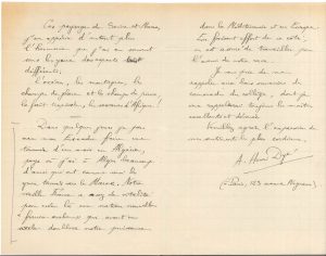 Il remercie de son ouvrage sur Hégésippe MOREAU : il relit toujours avec plaisir « les vers pleins de charme du délicat poëte de la Voulzie, et des roses de Provins », et il apprécie d’autant plus les paysages harmonieux, qu’il a souvent sous les yeux « l’océan, les montagnes, les champs de glace et les champs de pierre, la forêt tropicale, les savanes d’Afrique ! –
