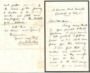 Il le remercie vivement de sa bienveillante assistance, dont il s’est senti très fier. Il estime toujours que si la situation restait la même pour un an ou deux, ce serait le meilleur arrangement pour lui-même, puisqu’il gagnerait de l’expérience et serait mieux connu en dehors du milieu géologique. Néanmoins, si la chaire est fondée, il ne doit pas hésiter, et l’amitié avec laquelle Horner a reçu sa requête, et le soutien promis par Sir Charles [LYELL] et Sir Roderick [MURCHISON] lui donnent quelque fondement pour espérer de réussir… Il fait des vœux pour que sa présidence de la société [Geological Society of London] soit aussi agréable à Horner qu’elle sera prospère pour la société… Le professeur PILLANS l’a régalé d’un vif compte rendu de son voyage à Londres au milieu d’une session parlementaire…