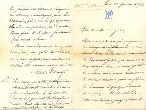 Marie Laurent, Mme Louis PASTEUR (1826-1910). L.A.S., Paris 22 janvier 1872, à Jules VERCEL ; 4 pages in-12 à son chiffre.