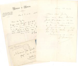 • Sa carte de visite avec félicitations autogr. de Mme Pasteur à Vercel, et 2 enveloppes autographes d’elle au même (1878-1879).