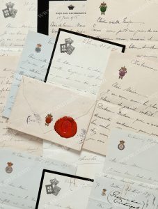 proviennent du château d'Eu et sont sur papier à en-tête de son monogramme, plusieurs sont découpées. Texte en français.