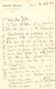 « Je reçois ta lettre et je penserai, selon son désir, à M. Parmentier. Chamberland [Charles Chamberland, biologiste et chef de service à l’Institut Pasteur] va se marier et j’ai promis d’être son témoin.
