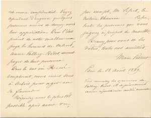 Marie Laurent, Mme Louis PASTEUR. L.A.S., Paris 28 août 1889, à Jules VERCEL à Arbois ; 3 pages in-8, enveloppe.