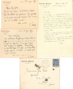 Louis PASTEUR. 3 L.A.S., 1891-1892, à Jules VERCEL à Arbois ; 2 pages oblong in-12 et 1 page in-8, en-têtes Institut Pasteur, enveloppes.