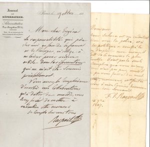 François-Vincent RASPAIL (1794-1878) chimiste, médecin et révolutionnaire. 2 L.A.S., 183- et 1847 ; 1 page in-8 à en-tête Journal Le Réformateur, et ¾ page in-8 à son chiffre avec adresse (fentes).