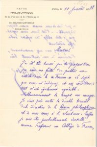 Malheureusement le temps me manque. Je suis pris entre le double travail de la Direction de la Revue philosophique et de mon cours à la Sorbonne. Enfin je vais être probablement installé comme Professeur au Collège de France, ce qui diminuera encore mon temps disponible »…