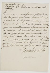 « Je suis tres reconoissante, Monsieur, de la part que vous voulez bien prendre a la perte cruelle que je viens de faire et a la juste douleur que ce malheureux evenement m’a causée. J’instruirai mon Pere de ce que vous me mandez d’obligeant pour lui dans cette facheuse circonstance »…
