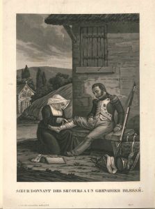 Images militaires : grenadier de la légion de Seine-et-Oise, sœur secourant un grenadier blessé, départ pour l’ambulance, vues de navires, fantassin par SEM ; fascicule des Types et uniformes.