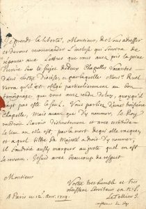Il lui adresse un document qui servira de réponse à ses lettres au sujet de « deux chapelles vacantes dans votre diocèse, et par laquelle Monsr Ruel verra qu’il est obligé particulierement au bon temoignage que vous avez rendu de luy, quoy qu’il n’ayt pas esté le seul. Vous parliez d’une troisième chappelle, mais avant que d’y nommer, le Roy voudroit scavoir distinctement et avec certitude le lieu ou elle est, par la mort de qui elle vacque, et a quel tiltre Sa Majesté a droit d’y nommer ; il faudroit aussy marquer au juste quel en est le revenu »…