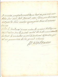 Françoise d’AUBIGNÉ, Marquise de MAINTENON (1635-1719) épouse morganatique de Louis XIV, fondatrice de la maison de Saint-Cyr pour les jeunes filles. L.S. « Maintenon » avec un mot autographe, Saint-Cyr 25 janvier 1710, à l’Évêque de...