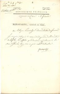 NAPOLÉON Ier (1769-1821). L.S. « Bonaparte », Q.G. au Caire 8 frimaire VII (28 novembre 1798), au citoyen POUSSIELGUE, administrateur des finances ; demi-page in-fol., en-tête Bonaparte, Général en Chef.