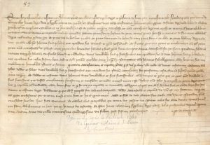 NIVERNAIS. CHARTE établie et signée par Petronne de GANAY, notaire à Saint-Pierre-le-Moustier, dimanche après la Pentecôte 1340 ; Vélin oblong in-fol. ; en latin.