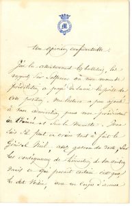 Aimable PÉLISSIER, Duc de Malakoff (1794-1864) Maréchal de France. P.A.S., Une opinion confidentielle, [1859 ?] ; 1 page et demie in-8 à son chiffre couronné et sa devise Virtutes Fortuna Comes.