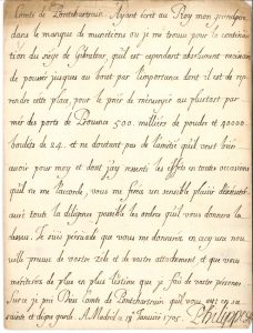 « Ayant écrit au roy mon grandpère dans le manque de munitions ou je me trouve pour la continüation du siège de Gibraltar, qu’il est cependant absolument nécessaire de pousser jusques au bout par l’importance dont il est de reprendre cétte place, pour le prier de m’envoyer au plustost par mer des ports de Provence 500. milliers de poudre et 40 000 boulets de 24 et ne doutant pas de l’amitié qu’il veut bien avoir pour moy et dont j’ay ressenti les effets en toutes occasions qu’il ne me l’accorde, vous me ferés un sensible plaisir d’exécuter avec toute la diligence possible les ordres qu’il vous donnera la dessus »…