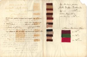 Envois d’échantillons de drap dans des couleurs à la mode (puce, noisette, « cheveux de la reine », etc.), avec prix, commentaires ou questions, par Louis, curé de Cuizery, séjournant à Lyon ;