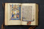■ 9 INITIALES HISTORIÉES SUR FOND OR, hautes de 9 lignes, avec un développement dans les marges qui peut occuper la hauteur de la surface écrite ou la totalité de la marge supérieure, marquant les grandes divisions du psautier biblique.