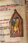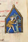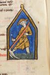 et mauve pâle dans un encadrement à l’or figurant les occupations du moi (f. 3-7v°) : un personnage émondant un arbre à la serpe (mars) ; un personnage tenant des rameaux ou branches dans les mains (avril) ; un fauconnier son faucon sur le poing (mai) ; personnage portant un fagot sur le dos (juin) ; personnage fauchant le foin (juillet) ; personnage moissonnant à la faux (août) ; un vendangeur (septembre) ; un personnage semant (octobre) ; la glandée (novembre) ; l’abattage du cochon (décembre).