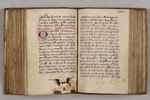 On relèvera aussi 2 dessins, dus à l’auteur des réclames (un ange, f. 119v° ; un personnage f. 168).