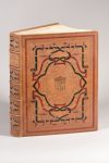 Peau de truie fauve, grand décor d’entrelacs et d’enroulements dessiné au moyen de filets à froid et de listels mosaïqués en vert foncé et rouge, armoiries à froid au centre, dos à cinq nerfs orné dans le même genre, bordure intérieure, tranches dorées sur marbrure (J. Légal rel. Angers).