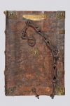 veau brun estampé à froid sur ais, cabochons, bouillon et fermoirs en laiton ciselés, dos à trois gros nerfs, nombre 33 peint en tête, décor des plats constitué de roulettes de rinceaux juxtaposées et de filets formant bordure, cadre central orné de filets dessinant une croix de saint André flanquée de gros fleurons, petits fers et phylactères portant le mot Maria (Reliure de l'époque).