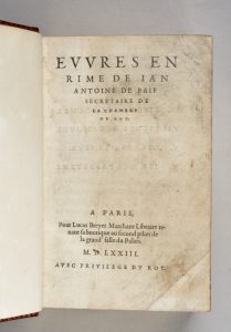 Édition collective, en partie originale, des œuvres de Jean-Antoine de Baïf (1532-1589), humaniste, diplomate et l’un des grands poètes de la Pléiade.