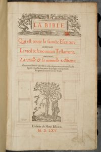 ♦ BELLE ÉDITION DE LA BIBLE PROTESTANTE, imprimée par Henri II Estienne à Genève et préfacée par Jean Calvin. Elle suit le texte de la Bible imprimée à Genève par Robert Estienne en 1553, avec le texte de l’Ancien Testament dans la version de Pierre Robert, dit Olivétan, et celui du Nouveau Testament révisé par Calvin et Théodore de Bèze.