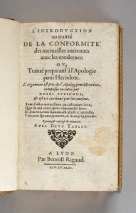 ESTIENNE (Henri). L'Introduction au traitté de la conformité des merveilles anciennes avec les modernes : ou, Traitté préparatif à l'Apologie pour Hérodote. Lyon, Benoît Rigaud, 1592. In-8, maroquin citron, encadrement d'un listel rouge...