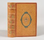 serti de filets, au centre médaillon ovale dessiné par un listel bleu canard et des filets, motif floral au milieu mosaïqué de vert et de lilas, dos orné de motifs mosaïqués entre les nerfs, dentelle intérieure, doublure de veau brique avec fer au Cupidon doré au centre, tranches dorées sur marbrure (Chatelin).
