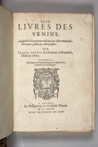 GRÉVIN (Jacques). Deux livres des venins, Ausquels il est amplement discouru des bestes venimeuses, theriaques, poisons & contrepoisons. Ensemble les œuvres de Nicandre, Medecin & Poëte Grec, traduites en vers françois. Anvers, De l'Imprimerie...