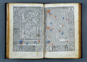 L’illustration comprend au second feuillet, la figure de l’homme anatomique et le Saint Graal au verso, des bois représentant les signes du zodiaque placés dans les bordures du calendrier, et 21 grandes figures (le Baiser de Judas, l’Arbre de Jessé, la Visitation, la Nativité, la Pentecôte, l’Adoration des bergers, la Fuite en Égypte, le Jugement dernier, la Crucifixion, Urie tué à la bataille, etc.).