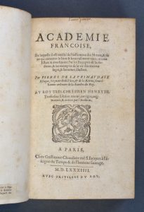 LA PRIMAUDAYE (Pierre de). Académie françoise. [...] Troisiesme Edition reveuë, corrigée, augmentée, & cottée par l’Autheur. Paris, Guillaume Chaudière, 1584. In-8, maroquin vert, janséniste, dentelle intérieure, tranches dorées...