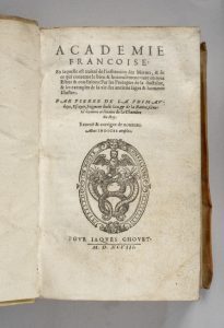 LA PRIMAUDAYE (Pierre de). Académie françoise : En laquelle est traitté de l'institution des Mœurs, & de ce qui concerne le bien & heureusement vivre en tous Estats & conditions : Par les Preceptes de la doctrine, & les exemples de la vie des...